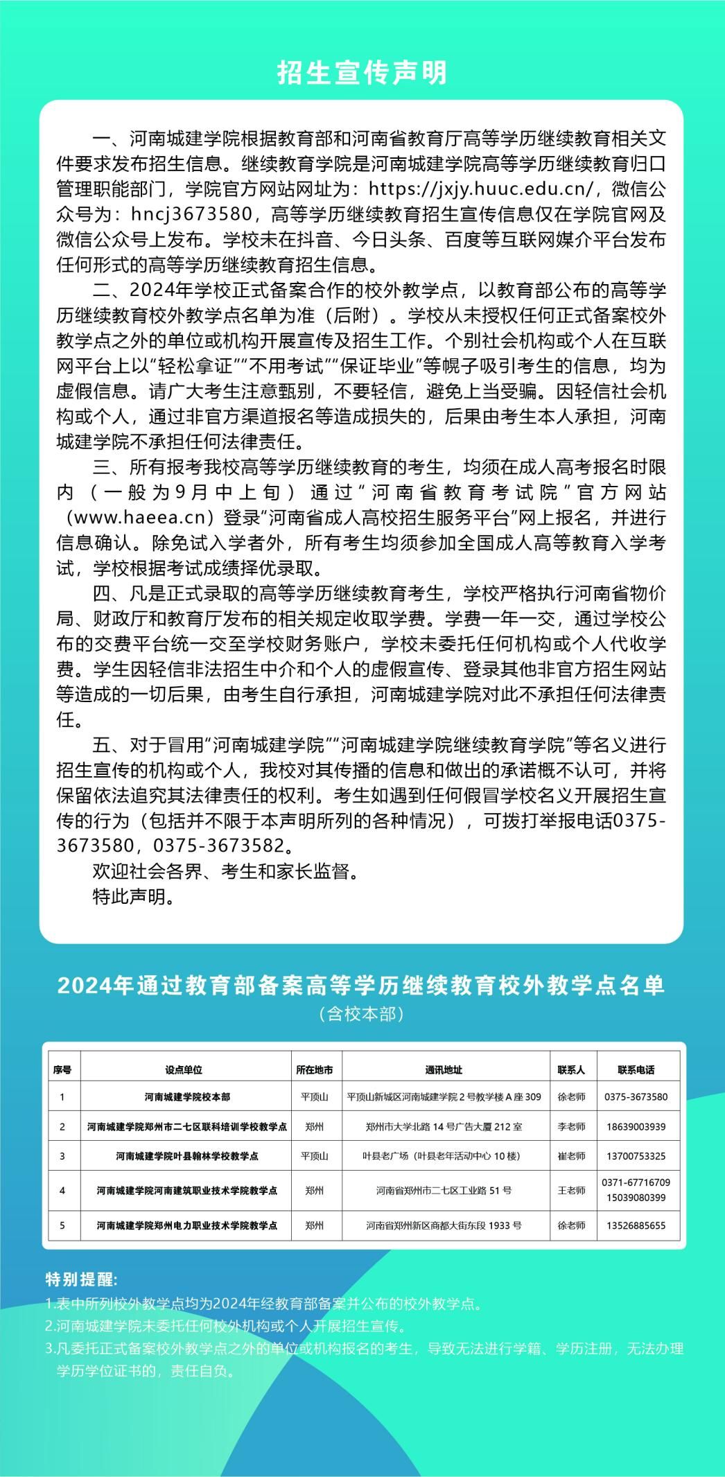 二、根据教育部和河南省教育厅关于高等学历继续教育校外教学点备案管理的要求,2024年公司安排招生计划的校内、校外教学点分别为:
