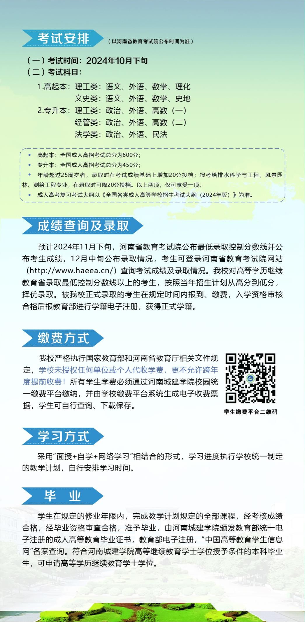三、请广大考生务必注意,beat365在线体育高等学历继续教育招生公告以河南省教育厅、河南省教育考试院、beat365在线体育官网及其微信公众号发布的招生简章和招生信息为准,考生访问“河南省教育考试院(http://www.haeea.cn)”,登录“河南省成人高校招生考生服务平台”进行报名,切记不要轻信其他非法招生中介和个人。同时,公司在员工录取报到前不收取任何费用,员工被公司录取后,学费一年一交,直接扫码交费至beat365在线体育财务处,公司未委托任何机构和个人代收代交学费。因轻信非法招生中介和个人的虚假宣传、登录其他非官方招生网站等造成的一切后果,由考生自行承担,beat365在线体育对此不承担任何责任。