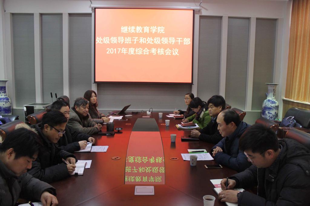 1月5日下午,beat365在线体育处级领导班子和处级领导干部2017年度综合考核在公司会议室进行,公司党委副书记张坤书、校第五考核组全体成员及该公司党政领导和全体教职工参加会议,会议由继续教育公司党支部书记樊铮钰主持。