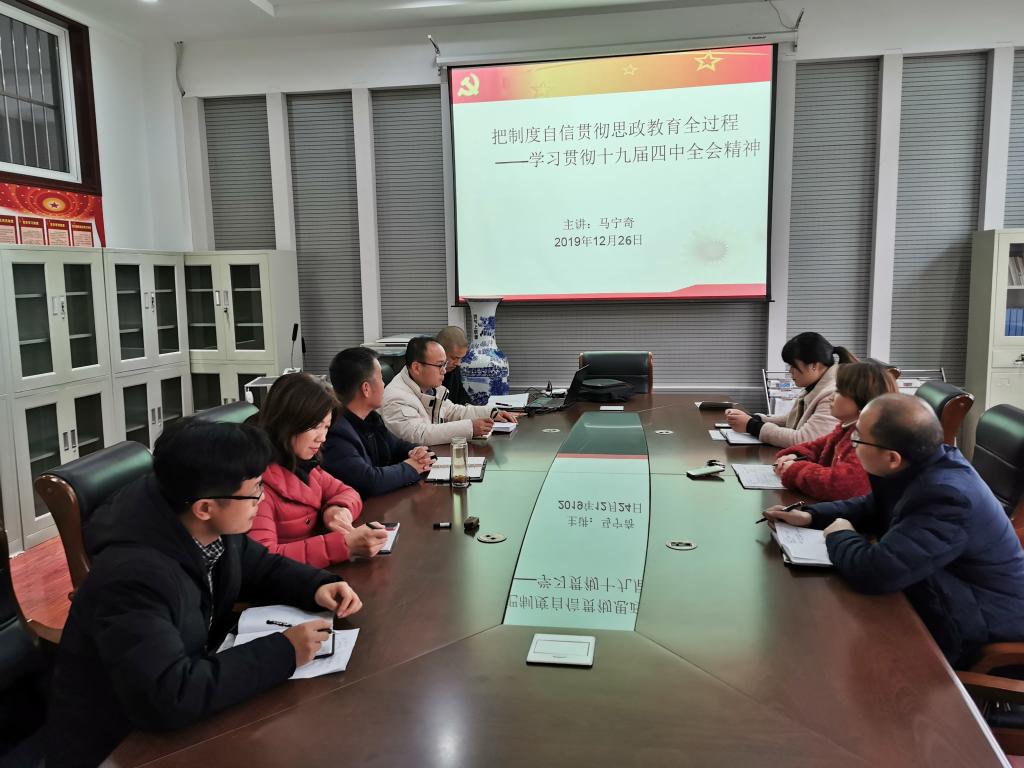 12月26日,beat365在线体育在二号楼A座310室举办学习贯彻十九届四中全会精神专题党课活动。党支部书记马宁奇以《把制度自信贯穿思想政治教育全过程》为题,为全体教职工讲了内容丰富、生动精彩的一课。
